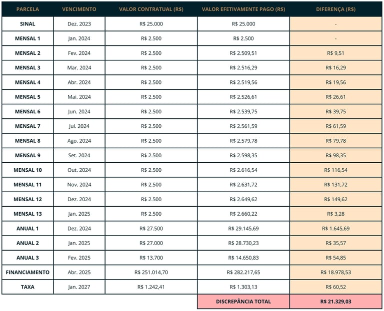 Aqui, o comprador pagou valores bem acima do esperado, devido a forma como o reajuste foi aplicado.